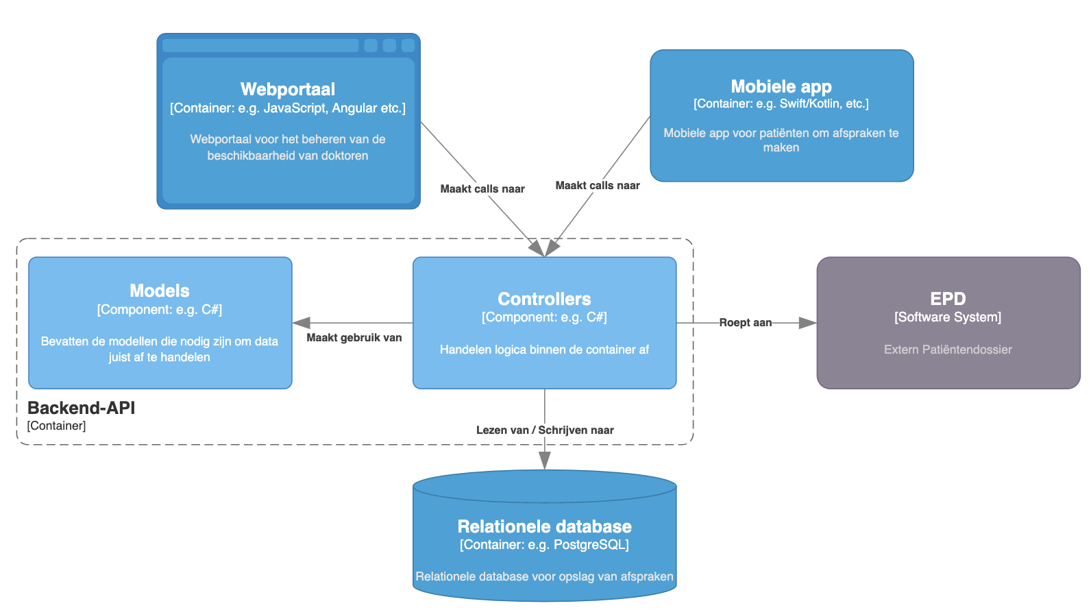 In de afsprakenplanner is er een backend-API (container uit niveau 2). Deze API bestaat uit meerdere componenten, zoals controllers om afspraken te maken en voor notificaties, en modellen om de data van afspraken juist te bewaren/gebruiken.